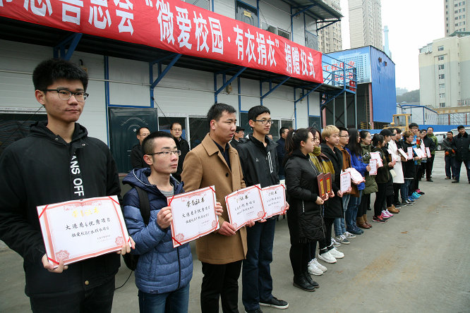 2016年11月19日上午,“微爱校园、有衣捐衣”捐赠仪式,在中建三局星海长岛工地举行。大连市慈善总会副会长兼秘书长刁成宝、市建委安监站领导、参与活动的高校义工联盟义工代表、公益社团代表、农民工代表及媒体记者等参加。