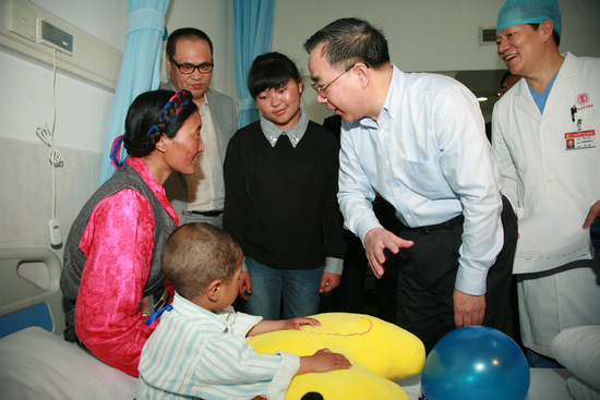 4月1日上午,中央政治局委员、广东省委书记胡春华来到广州军区广州总医院,看望由中华慈善总会免费救助的西藏贫困家庭先天性心脏病儿童。