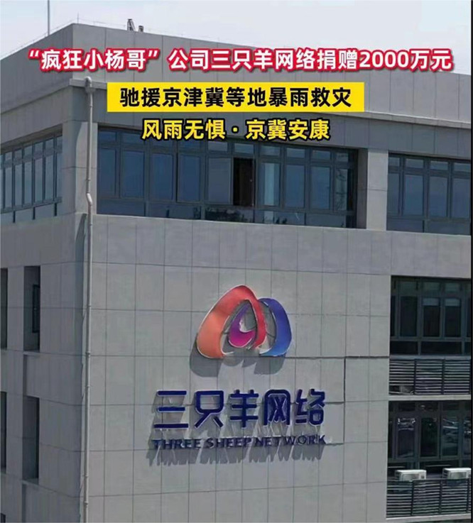 洪水肆虐,守望相助,灾情时刻牵动着社会各界的心。为紧急驰援京津冀洪涝灾区,合肥三只羊网络科技有限公司向中华慈善总会捐赠2000万元,用于灾区救援,采购应急物资、安置受灾群众,特别是后续受灾地区重建、医疗援助、困难群众帮扶等,希望和灾区群众同心协力,共渡难关。